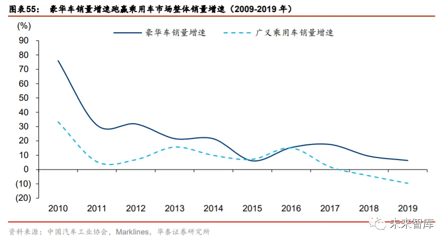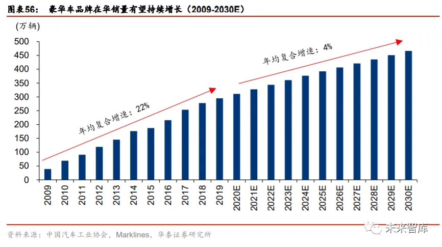过去的 10 年中,伴随着中国经济的快速增长和汽车市场整体的蓬勃发展,豪华车销售也 实现了快速增长,豪华车销量在 2009 至 2019 年增长了 600%,年复合增速达到 22%, 同期中国乘用车市场整体年复合增速为 8%,豪华车销量增速跑赢乘用车行业整体。扩大 内需是内循环的重要环节,我国拥有较大的人口基数和广阔的内需市场,豪华车作为消费 升级的主要方向,引导豪华车消费是汽车行业内循环的重点之一。我们认为在扩大内需和 促进消费升级的背景下,豪华车需求有望维持稳健的增长趋势。