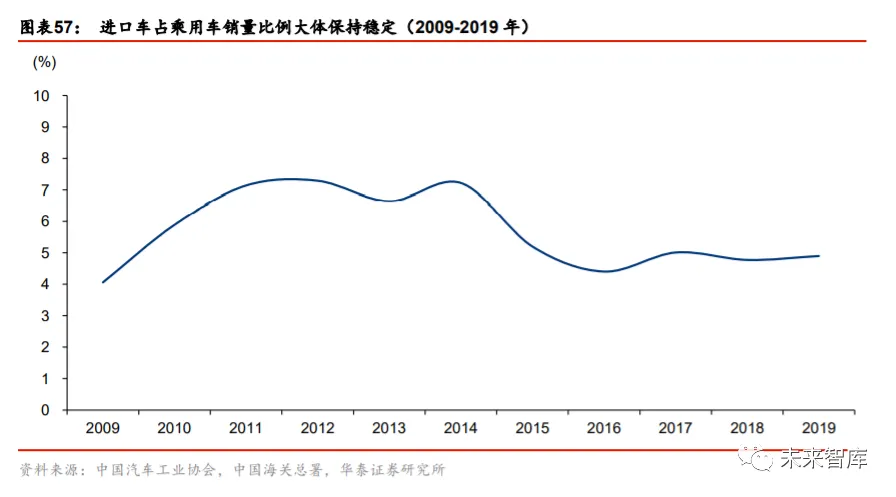 我国的进口车以豪华品牌为主,2009 年进口车销量约 42 万辆,占国内汽车销量比例为 4.1%,到 2019 年进口车销量增长 151%至 105 万辆,占国内汽车销量比例为 4.9%。从 绝对量来看,进口车销量实现了大幅的增长,但从销量占比来看,进口车占国内汽车销量 比重虽然略有波动,但整体维持了相对稳定。我们认为豪华车行业的发展符合内循环为主, 内外循环相互促进的发展模式。在进口车占比保持相对稳定的情况下,豪华车销量仍然实 现了快速的增长,我们认为其主要原因是豪华品牌的国产化,通过国产化实现了豪华车的 内循环,于此同时,进口车销量的大幅增长,也带动了海外车企的收入和利润增长,实现 了内外循环互相促进。
