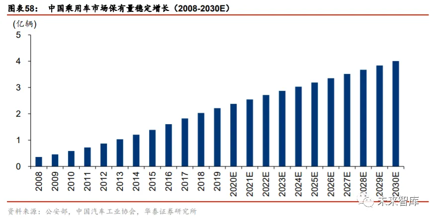 虽然新车销量在 2018-2019 年连续下滑,但汽车保有量和汽车后市场需求持续增长。截至 2019 年底,国内乘用车保有量为 2.2 亿辆。由于每年新车销量在 2,000 万辆以上,同时 总体车龄较为年轻导致报废汽车数量较低,总保有量将逐步增长。我们估算乘用车保有量 将逐步增长至 2030 年的 4.0 亿辆,年复合增长率为 5.5%。