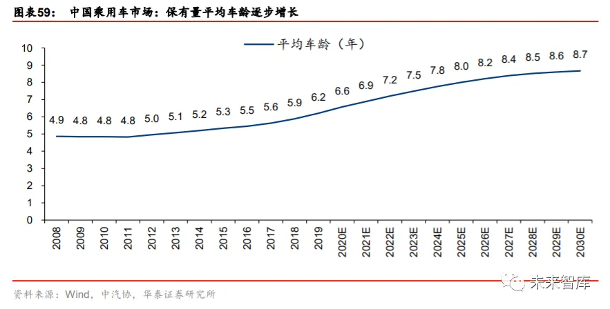 车龄的逐步提高,是汽车售后维修保养市场增长的另外一个主要驱动力。根据我们的测算, 2019 年中国全部保有乘用车的平均车龄为 6.2 年,总体较为年轻。随着时间的推移,基 于我们 2020-2030 年新车销量的预测,预计平均车龄会逐步增长至 2030 年的 8.7 年。