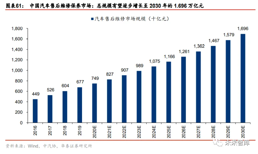 我们估计中国乘用车售后维修保养市场将从 2019 年的 6,770 亿元稳步增 长至 2030 年的 1.696 万亿元,年复合增长率 8.7%。