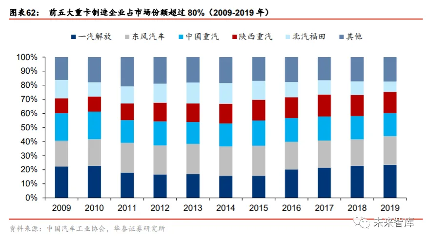 我国重卡行业基本实现了自主可控,我国重卡行业的主要生产制造厂商都是中国本土企业。2019 年重卡市场份额最大的企业为一汽解放(000800 CH,增持,目标价 17.00 元),市 场份额 23%;第二大为东风汽车(489 HK,无评级),市场份额 20%;第三大为中国重 汽(3808 HK,无评级),市场份额 16%;第四大为陕重汽(未上市),市场份额 15%;第五大为北汽福田(600166 CH,无评级),市场份额 7%。前五大重卡制造商市场份额达 到 83%。