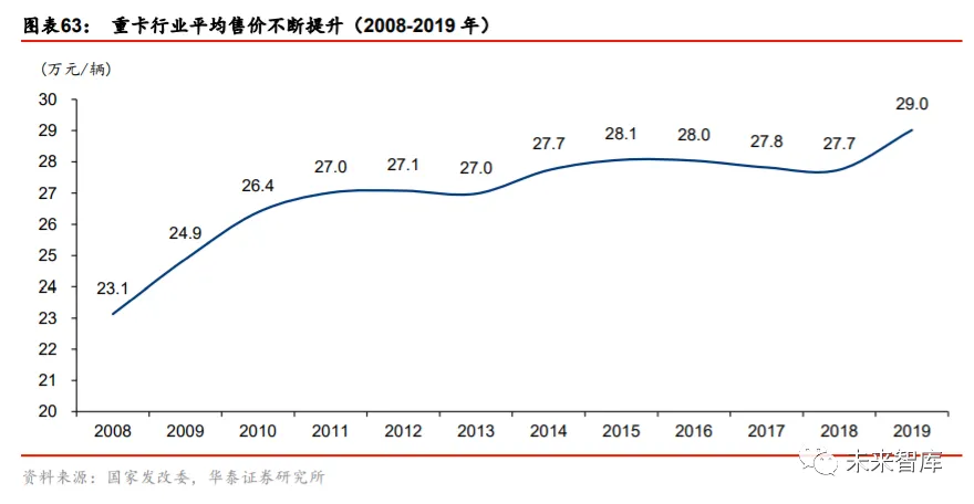重卡行业存在持续进行的技术升级,根据国家发改委的统计,中国重卡销售均价从 2008 年的 23.1 万元,逐步上升至 2019 年的 29.0 万元,平均每年增长 2%。重卡技术含量以及 排放标准的提升,是 2008 年至今重卡销售均价稳步上升的主要原因。目前行业的技术升 级仍然在持续,2019 年我国进入“国六”排放标准阶段,随着更加严格的排放标准的实 施,对重卡企业的研发能力提出了更高的要求,使得行业进入壁垒进一步提高。同时,重 卡发动机的售价也相应增加,同排量的发动机,国六标准产品相比国五标准产品 ASP 提 升约 1-2 万元,占重卡售价的 5-10%左右。