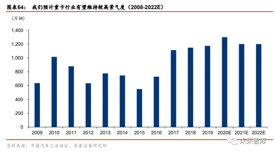 我们认为重卡行业符合内循环的特点,通过内生的研发投入,实现产业链价值的提升,强 化了国内本土企业的竞争实力。我们认为在科技赋能打通技术升级,实现国内技术内循环 的背景下,重卡行业将持续收益。展望 2021-2022 年,我们认为重卡行业销量将维持在较 高水平。