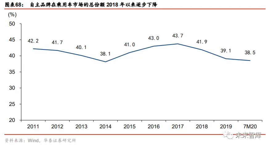 在乘用车市场,中国自主品牌起步较晚,品牌、技术等比起海外成熟市场里面的国际大型 汽车集团尚有较大的差距。过去,专注于中低价位区间的中国自主品牌企业在国内受到较 强的政策保护,同时叠加中低端需求增长较快,本土自主品牌占据了一定的市场份额。2017 年,本土品牌市场份额达到 43.7%的高点,2018 年以来逐步下滑。我们认为,本土品牌 总体的市场份额未来几年有可能继续下滑,主要原因包括: