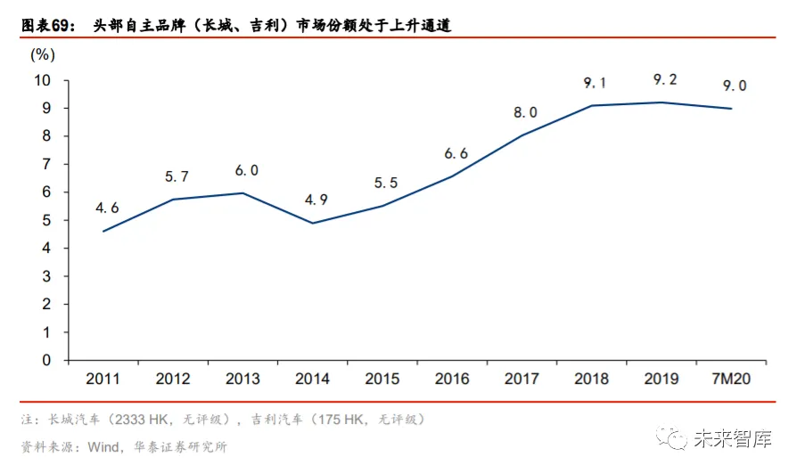 尽管中国自主品牌市场份额处于下滑趋势,但头部企业凭借不懈的努力,在品牌、研发、 制造、营销、网络等方面持续投入,逐步发展壮大,在国内汽车市场中的份额总体处于上 升趋势。考虑到部分小型自主品牌逐步推出市场,我们认为市场份额向头部自主品牌集中 的趋势未来有可能加速。