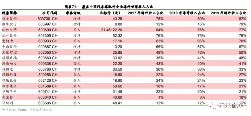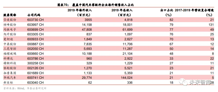 我们覆盖的部分中国汽车零配件企业海外销售占比较高。如果按照 2019 年全年营业收入 来看,岱美股份有 82%的销售额来自于海外市场,占比较高的企业还包括继峰股份(79%, 收购格拉默导致)、均胜电子(77%)、旭升股份(76%)、爱柯迪(70%)、中鼎股份(67%)、 三花智控(50%)、福耀玻璃(48%)、科博达(33%)、拓普集团(21%)等。中国零部 件企业从国产替代到走向全球,证明了制造能力、产品质量、性价比等已处于世界前列, 先在部分细分行业突破,我们认为未来中国零部件企业在全球市场份额将进一步提升。