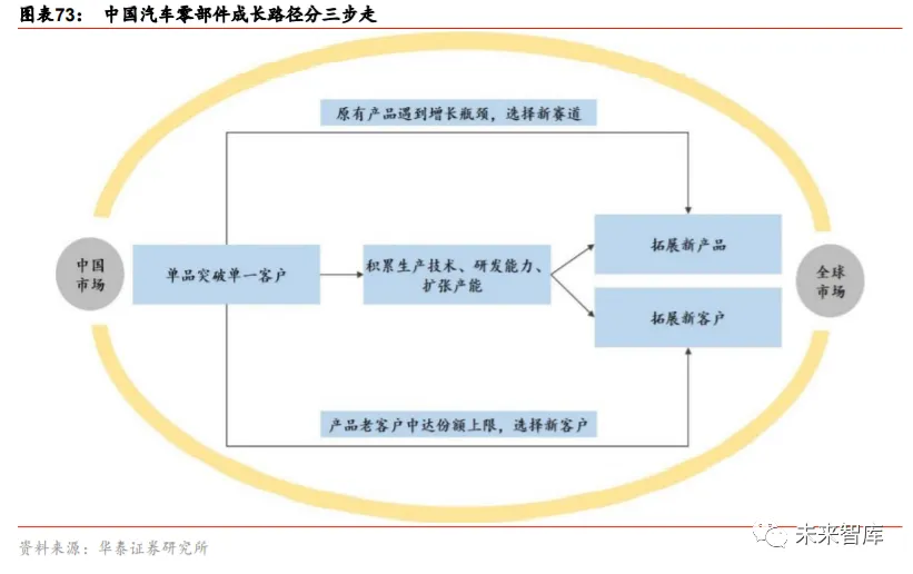 中国汽车零部件企业成长为世界性零部件厂商主要分三步走。具体为:单品突破单一客户、 积累生产技术和研发能力、拓展新客户或新产品。大多数汽车零部件企业发展的第一阶段 是单一产品或者单一品类产品服务单一大客户;第二阶段是随着大客户销量增长而逐步放 量,并迅速积累生产技术、研发能力、资金和扩张产能;第三阶段是将成熟产品导入新客 户或者拓展新产品,寻找新的增长点,最终从国产替代拓展供货全球。目前上市公司中, 大多数公司是第二步、第三步同时走的,主要是“老客户导入新产品”、“新客户导入旧产 品”的方式,获得新、老产品的持续增长。