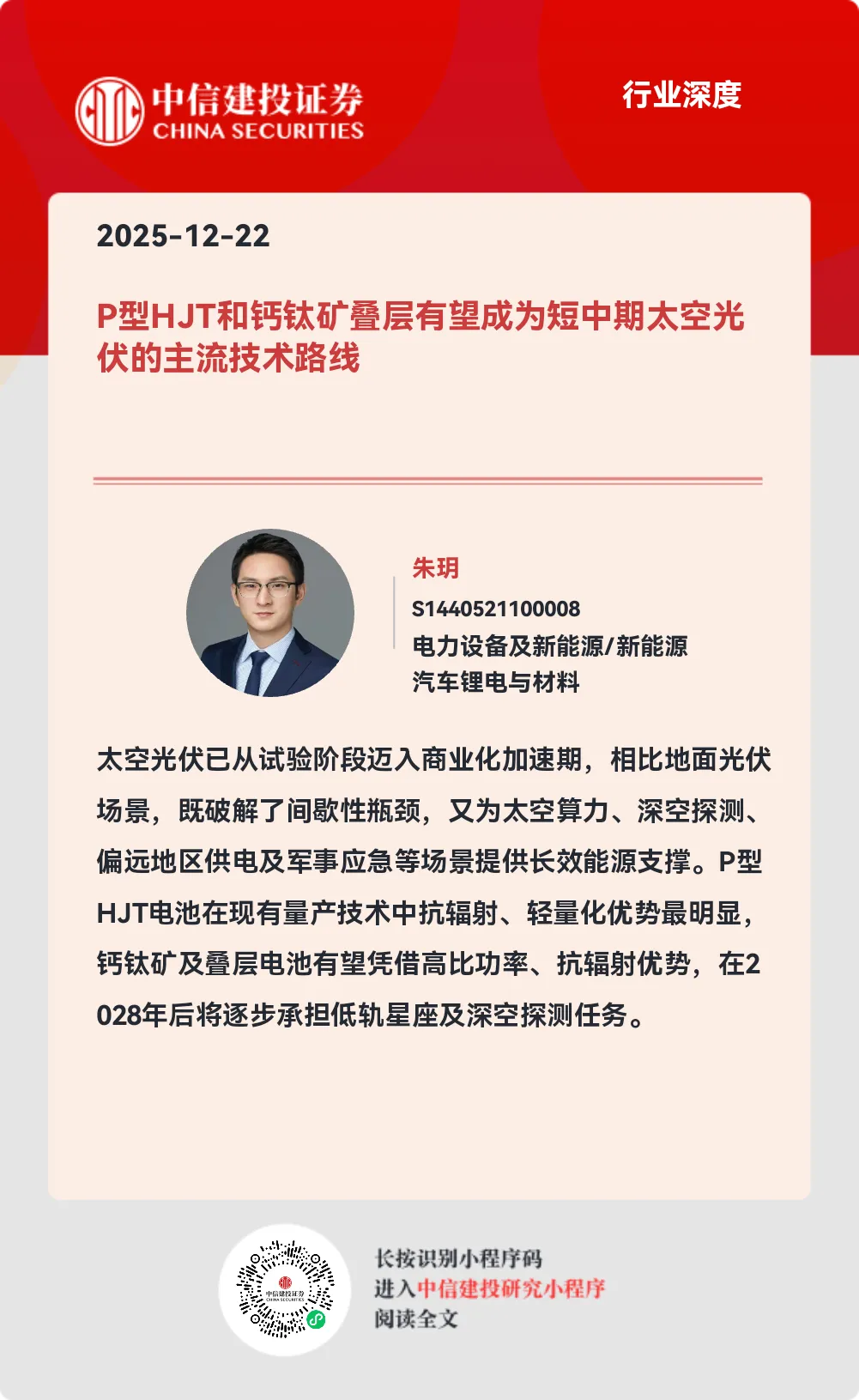 证券研究报告名称:《P型HJT和钙钛矿叠层有望成为短中期太空光伏的主流技术路线》