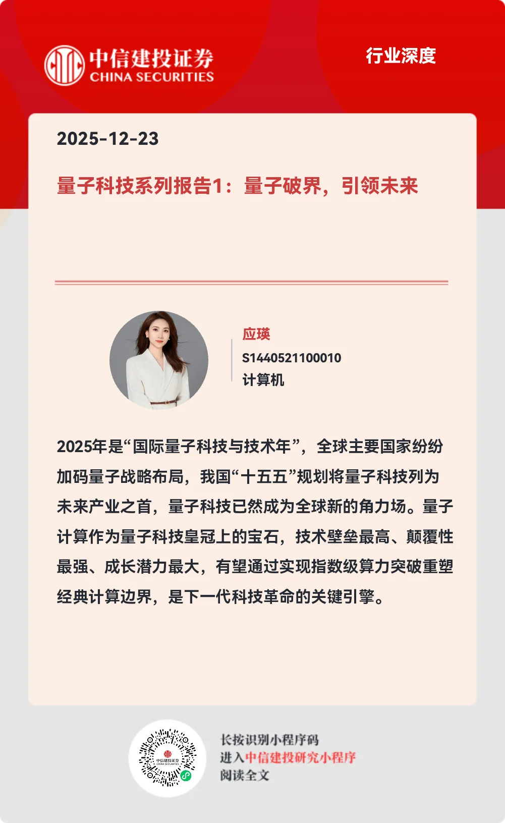 2025年是“国际量子科技与技术年”,全球主要国家纷纷加码量子战略布局,我国“十五五”规划将量子科技列为未来产业之首,量子科技已然成为全球新的角力场。量子计算作为量子科技皇冠上的宝石,技术壁垒最高、颠覆性最强、成长潜力最大,有望通过实现指数级算力突破重塑经典计算边界,是下一代科技革命的关键引擎。
