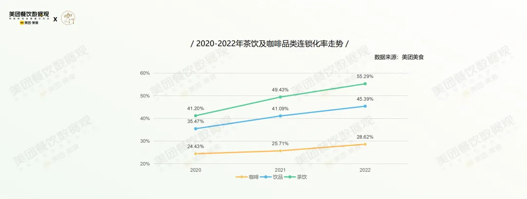 近3年,相比咖啡品类,现制茶饮连锁化率发展更快,从2020年41.2%一路增长到2022年55.29%(此处对连锁化的定义是10家门店以上,不包括10家)。