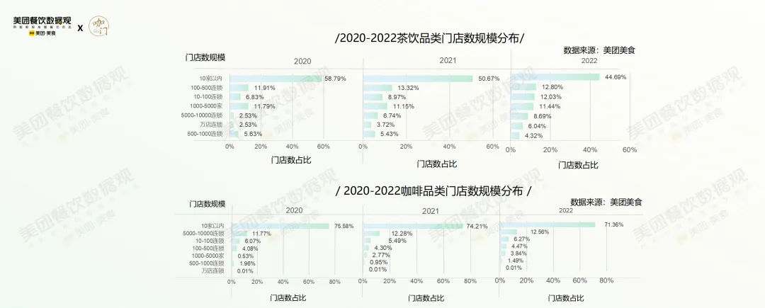 在茶饮品类中,单店、10家以内小店的比例相对较低,2022年10家店以内的门店规模仅占44.7%。