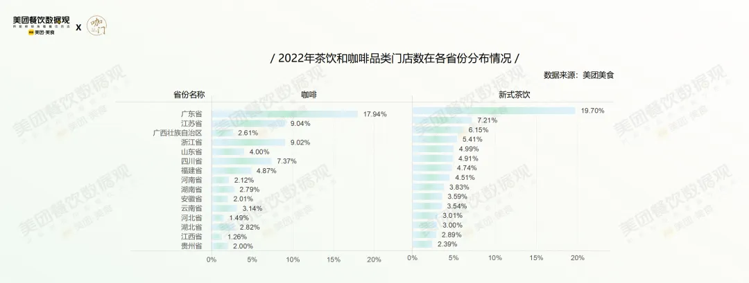 近两年,5000~10000家及万店规模的茶饮门店数占比都有所增长,连锁化规模明显强于咖啡,其大型连锁品牌发展势头较好。
