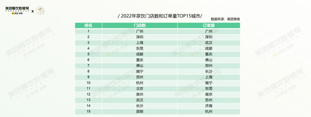 2022年茶饮订单量或门店数上榜TOP10城市均包括:广州、深圳、上海、成都、重庆、佛山、南宁、苏州、杭州等;佛山、南宁等小众城市数据表现不俗,值得未来关注。