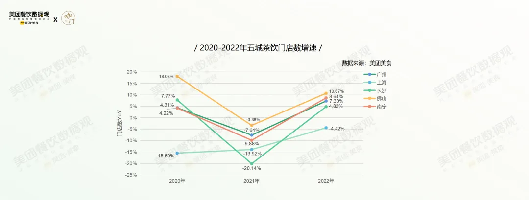 茶饮品类发展代表城市中,广州、上海、长沙、佛山、南宁等城市值得关注。