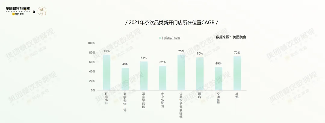从2021年数据来看,茶饮新开门店更倾向于住宅小区,其次是写字楼/园区。
