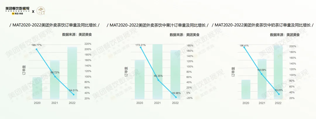 2020-2022三年滚动年美团外卖数据显示,全部茶饮产品订单量同比去年增长34%,但增速下降。