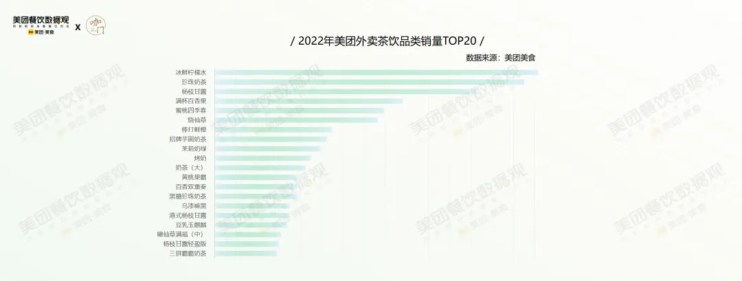美团线上2022年高销量产品TOP20中冰鲜柠檬水、珍珠奶茶、杨枝甘露位列前三;烧仙草、茉莉奶绿、百香果饮品表现优异。