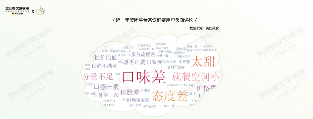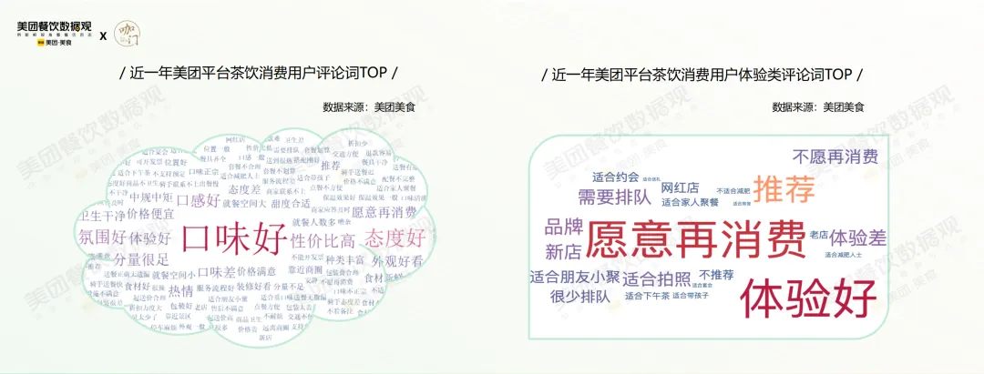 近一年在美团平台上,茶饮品类消费用户的评论大多围绕“口味好、态度好、性价比高、氛围好”等词汇;
