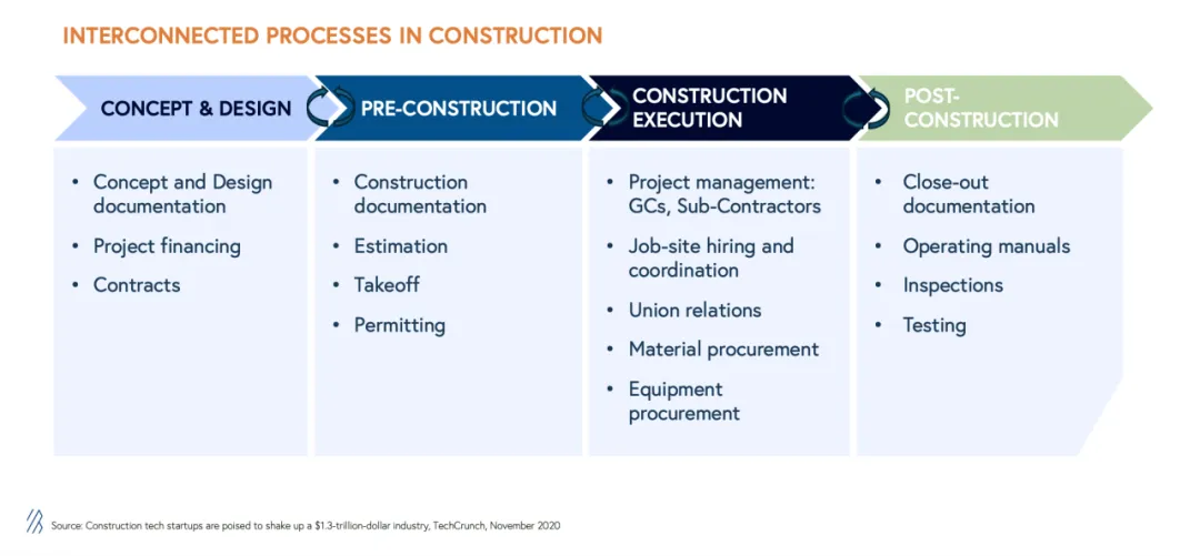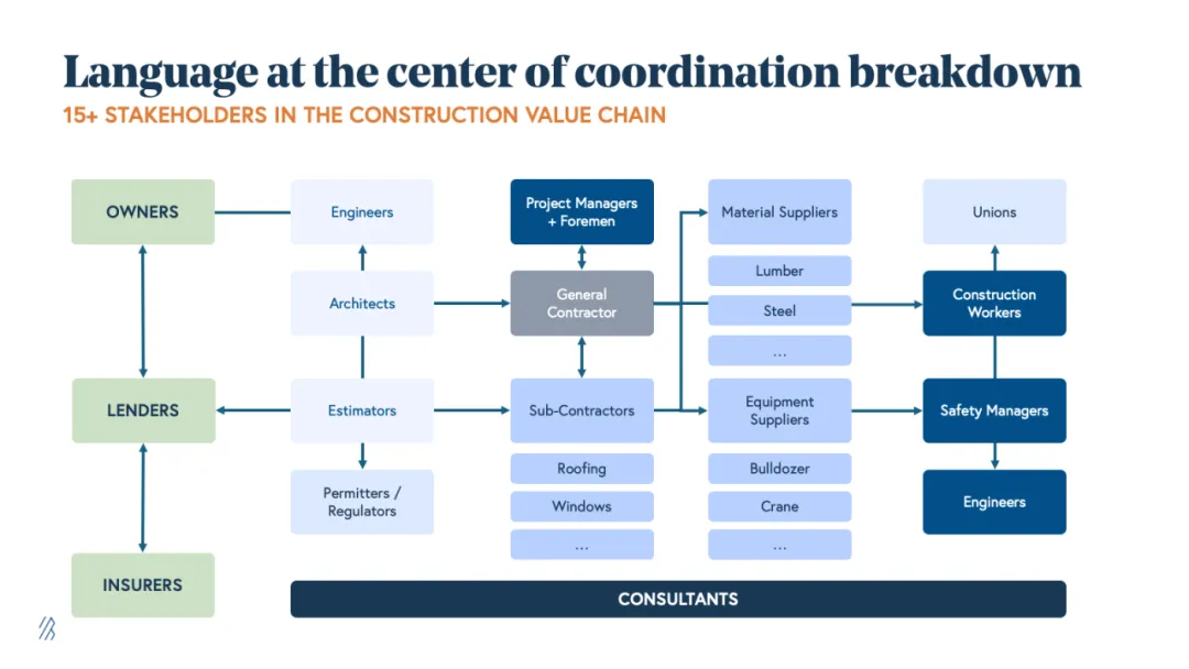 每个建筑项目的核心本质上都是多模态语言的运作:涉及合同、蓝图、施工文档、项目计划、安全报告、采购订单、变更单和验收报告。这是一个高度依赖人力且本质上需要亲临现场的过程,涉及总承包商、分包商、工程师、监管机构、贷款方、保险公司和业主等15个以上利益相关方群体之间的持续沟通。项目生命周期的每个阶段(如设计、施工前、施工和竣工收尾)都会在问责制和信息流转中产生摩擦。