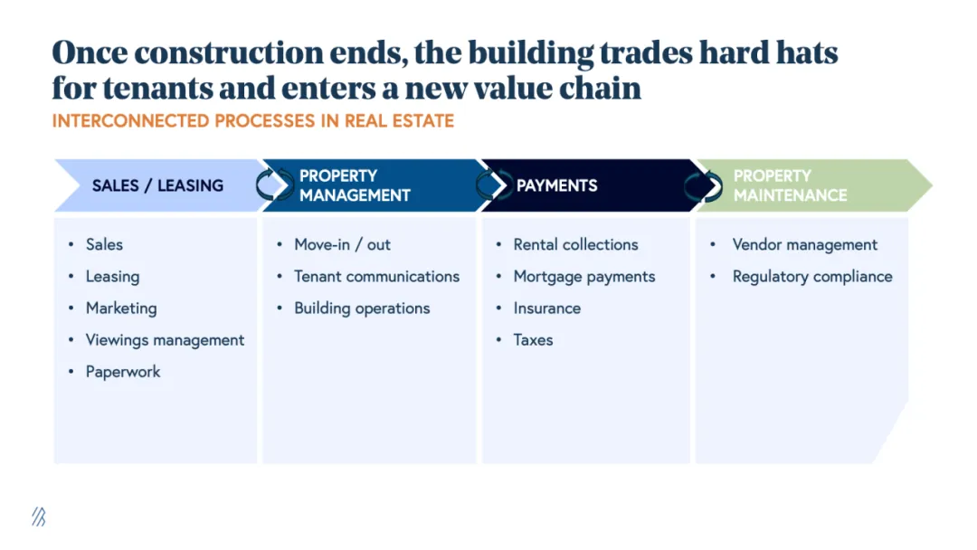 当建筑施工完成建筑脱下安全帽迎来租户,便进入跨越销售、租赁、支付、物业管理和维护的全新价值链。尽管该价值链因资产类型(住宅、商业、工业及特殊用途)而异,但其根基始终如一:房地产是信任驱动的行业,本地知识、人脉网络与深层关系决定成败。
