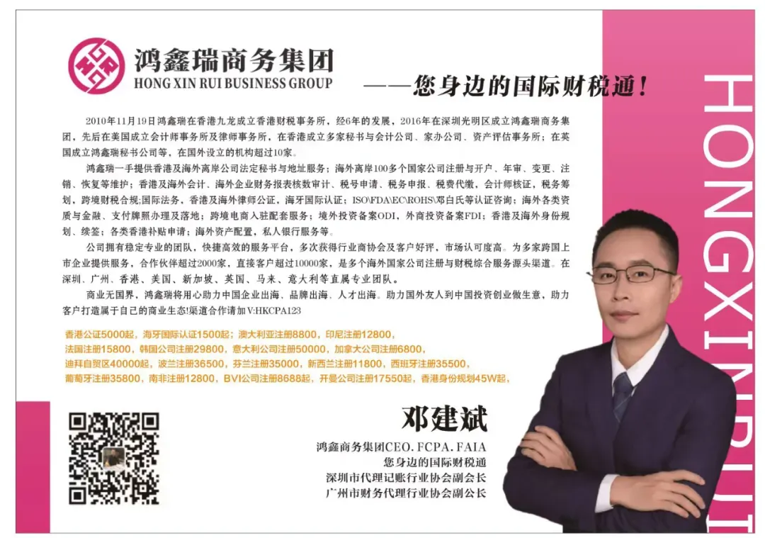 鸿鑫瑞一手提供香港及海外离岸公司法定秘书与地址服务;海外离岸100多个国家公司注册与开户、年审、变更、注销、恢复等维护;香港及海外会计、海外企业财务报表核数审计、税号申请、税务申报、税费代缴,会计师核证,税务筹划,跨财税合规;国际法务,香港及海外律师公司,海牙国际认证;ISO\FDA\EC\ROHS\邓白氏等认证咨询;海外各类资质与金融、支付牌照办理及落地;跨境电商入驻配套服务;境外投资备案ODI,外商投资备案FDI;香港及海外身份规划、续签;各类香港补贴申请;海外资产配置,私人银行服务等。
