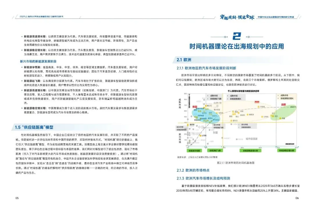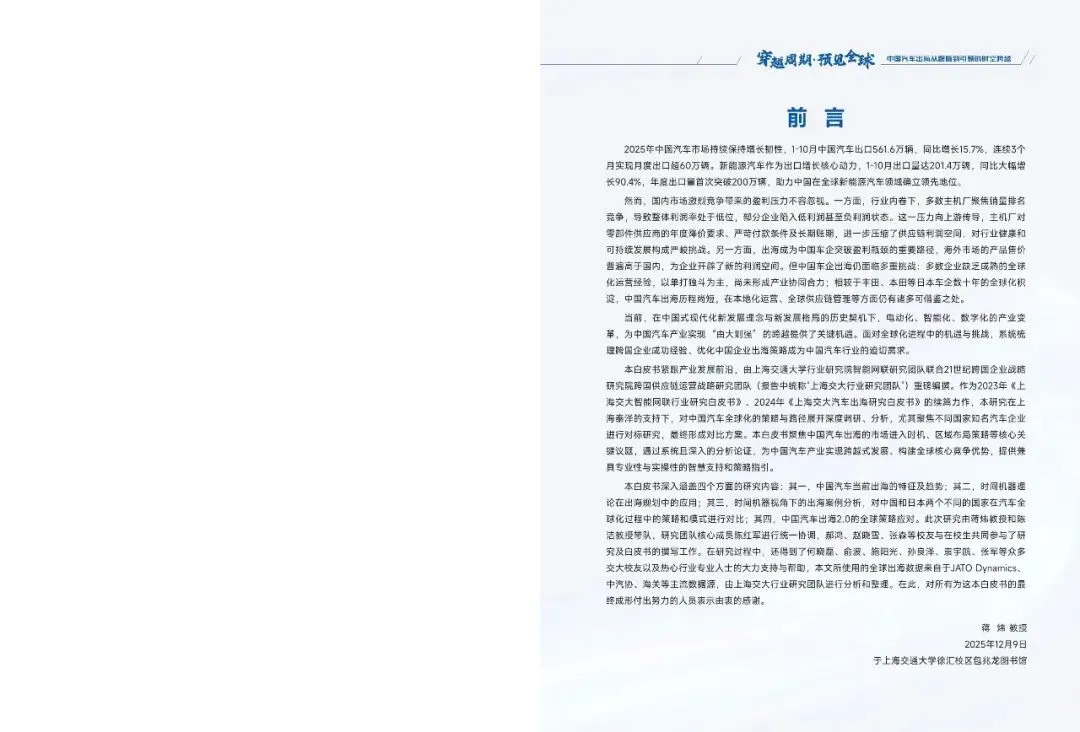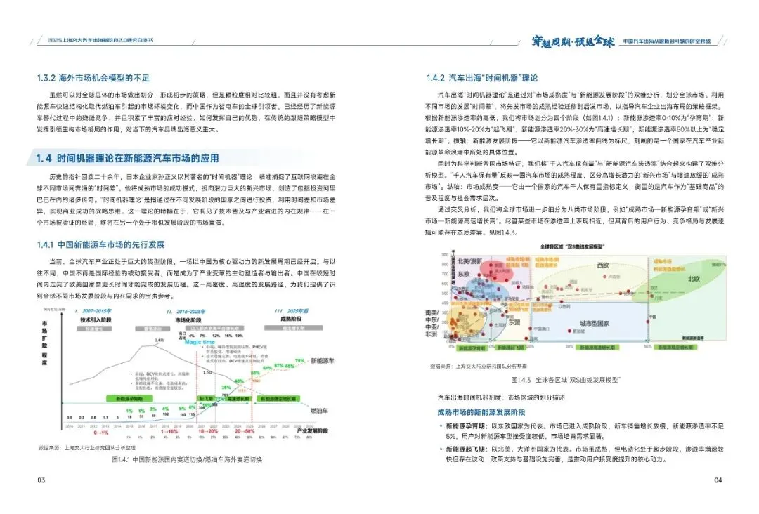 本白皮书深入涵盖四个方面的研究内容:其一,中国汽车当前出海的特征及趋势;其二,时间机器理论在出海规划中的应用;其三,时间机器视角下的出海案例分析,对中国和日本两个不同的国家在汽车全球化过程中的策略和模式进行对比;其四,中国汽车出海2.0的全球策略应对。