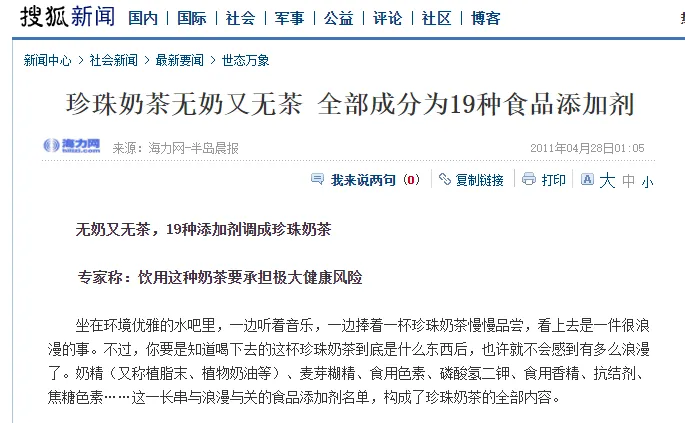 台湾在珍珠奶茶大火之前,火的是泡沫红茶,是冷泡茶的新的商品化形式。那么据我查证,中国古代在明朝时就发明了冷泡茶饮的形式。在后来茶饮的商品化形式中,泡沫红茶最先应用了冷泡的形式。这么一说大家有没有想起来瓶装茶类饮料:冰红茶,对的就是从冰的泡沫红茶来的。大家知道中国内地最早的冰红茶类瓶装饮料叫什么名字吗?关于珍珠奶茶的始创者,在台湾省是有较大争议的,一种说法呢是台中市的春水堂于1983年实验成功最先创立的,另一种说法是台南市的翰林茶馆在1987年发明的。那么走法律程序之后,法院也没有支持两家的诉讼请求,以珍珠属于普遍食材而驳回了两方的请求。这个不用管并不影响我们的分析,最早的珍珠奶茶的做法里面加水果、糖浆、糖渍地瓜和珍珠,这样一做完,茶的浓度就被降低了不少,也可以说成物理上就减少了茶的功能性;与此同时,改变了茶原本的口味和口感的层次,由苦、涩、酸、甘的味型转变为了甜为主的味型,同时由于加入了不同种类的原料进去后,茶类的味型层次也发生了巨大变化。与此同时,纯粹喝的就变成了喝的加嚼的了,这样茶类的口感同样发生了巨大的变化。珍珠奶茶产品的发展路径:不仅是去功能性,更是向饮料化方向发展。这条发展路径是现做茶饮类别发展至今都在遵循的过程,只不过在2015年这个档口,大家所说的这个新茶饮类别,把茶的功能性往回找了找,但是也没有完全找回来。这也是现做茶饮类别与咖啡馆类别复购率和复购周期的差异性原因,其中内里还有一个隐藏点,后面再说。一旦奶茶类别去功能性而朝着饮料类别的需求发展,往里面加什么东西都是可以理解的,搞什么花活儿也是可以理解的。为什么呢?在回答这个问题之前,先和大家分享一下分析食品饮料类别产品的一个定类分析模型,也是我们内部的分析模型,叫作《定类餐饮产品分析框架》,方便大家理解后面产品分析的内容。我们总结出分析餐饮类产品的6个维度的框架,第一个是:性状,例如粒、粉、糊、片、条、段、包、团……都是食物表现出的外表的性状。第二个是:味型,例如酸、甜、苦、咸、鲜……都是食物与舌头接触后基于味觉的反馈,味型多为复合形态。第三个是:口感,例如软、糯、脆、弹、硬、黏、筋道、麻、辣……都是食物与口腔接触后基于触感的反馈。第四个是:复合,例如一碗面条汤汤水水有配菜的有面条的复合感受。第五个是:功能性,例如提神、抗疲劳……内含在食物后面的功能性作用。第六个是:需求类型,例如刚需、非刚需、场景化需求……与消费频率和复购周期有关系的维度。相较于咖啡类别的功能性需求的刚性,现做茶饮类别的发展方向显然是朝着非功能性的非刚性需求方向发展。当现做茶饮类别产品失去功能性的时候,它只能朝着饮品类别所要求的味型、口感、复合上面发力,让人们喜欢并习惯这个产品。也就是说:好喝,口味适应性和口味花样性变得极为重要。那么什么味型的口味适应性最高,大家可以猜一下,把答案打在公屏上,发上来了吗?咱们对一下答案。没错就是:甜味。而且准确的说是以甜味为主的复合的味型与口感。那么好喝需要的是什么?让所有人都觉得好喝嘛,这个最重要。至于如何才能做到,咱们后面再说。我们继续说回台湾珍珠奶茶的发展路径,由于这一创新性的举措,珍珠奶茶开始如野草般无预兆地发展起来,仅仅半年时间就迅速成为台湾岛的第一饮品,并迅速蔓延至香港自治区和内地。1997年快可立珍珠奶茶进入大陆,港台片里经常出现的奶茶饮品,迅速得到了消费者的认可,现在资料显示的价格是非常贵的,大概是8元一杯,但仍受到消费者的狂热追捧。到了2004年街客、地下铁等现做珍珠奶茶品牌裹挟着《流星花园》的潮流,成为新一轮的爆红的奶茶店,而它们当时的售价仅为3-6元左右。奶茶店类别一时间呈爆炸性发展趋势,而在这个过程中,连锁品牌只占一小部分,更多的是街边的独立店和摊儿店的形式。那时候3块钱一杯也挺贵的,我和我同学当时喝的更多的就是类似于这种的奶茶,就是上面说的摊儿店。这是我在2016年做晨光集团战略咨询时候在线下走访的时候,在东莞某个学校门口拍的照片儿,这个价格和我当时买的一样,小杯5毛,大杯1块。那场面,校门一开,一堆孩子蜂拥而来。当时多数奶茶店原材料的选择极为廉价,各种粉末勾调,甚至添加一些不符合食品安全的珍珠和其他添加物等等。面对行业如此不规范的发展,很快各种关于类别的负面新闻就开始出现。什么奶茶里面既没有奶也没有茶,珍珠是凝胶做的等负面新闻开始铺天盖地的传播,由于一些企业的违法违规操作,整个类别彻底的被打趴下了。在一段时间内,珍珠奶茶被人们定义成垃圾饮品。这对于一个类别来说,这就是灾难性的负面认知。而且负面共识如此普遍,类别基本很难翻身。随后奶茶类别进入了去珍珠化发展周期,例如烧仙草类的奶茶类饮品店开始慢慢发展。但是由于类别一直是负面报道缠身,并没有掀起什么风浪,一直处于一个潜伏发展的阶段。奶茶类别在这一时期,所面临的人群是以:低龄化和女性化为主的人群。多数门店都会开在学校附近,价格相对来说较为低廉,基本上小学店5毛起,大学店3元起,开在大学门口比开在小学门口的贵一些。奶茶在这一时期是一个低端且负面的类别,什么概念?就是在主流认知
