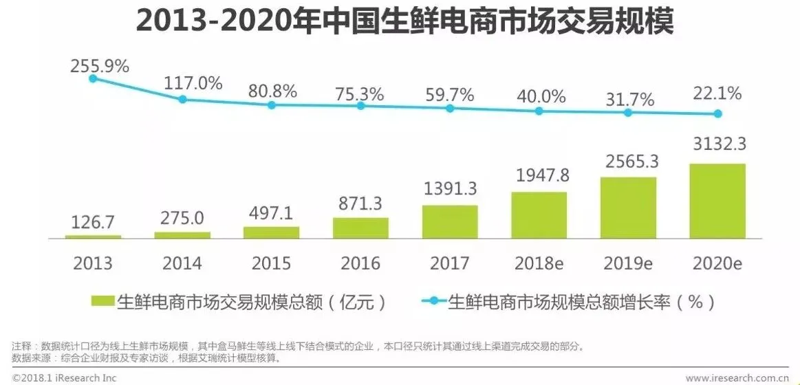 中国生鲜电商市场发展迅速,平均每年保持50%以上的增长率。2016-2017年市场迎来洗牌期,大量中小型生鲜电商或倒闭或被并购,市场遇冷;但与此同时,阿里京东等电商巨头入局,不断加码供应链及物流等基础建设投资,并带来了一系列创新模式,使得生鲜电商市场重振活力。2017年中国生鲜电商市场交易规模约为1391.3亿元,同比增长59.7%。