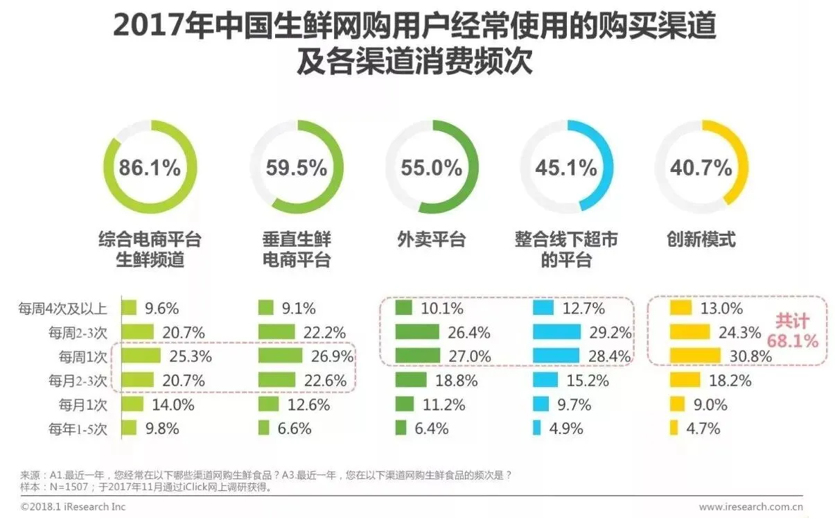 艾瑞将近两年兴起的“餐饮+超市”的生鲜模式称为创新模式,在用户网购生鲜常用的渠道分析中,综合电商平台为网购生鲜最常用的渠道,超过八成的生鲜网购用户经常在综合电商平台生鲜频道购买生鲜食品,综合电商平台流量优势明显。外卖平台、整合线下超市的平台、创新模式三个渠道用户相对较少,但消费频次更高,每周在创新模式消费至少1次的用户在创新模式整体用户的占比高达68.1%。