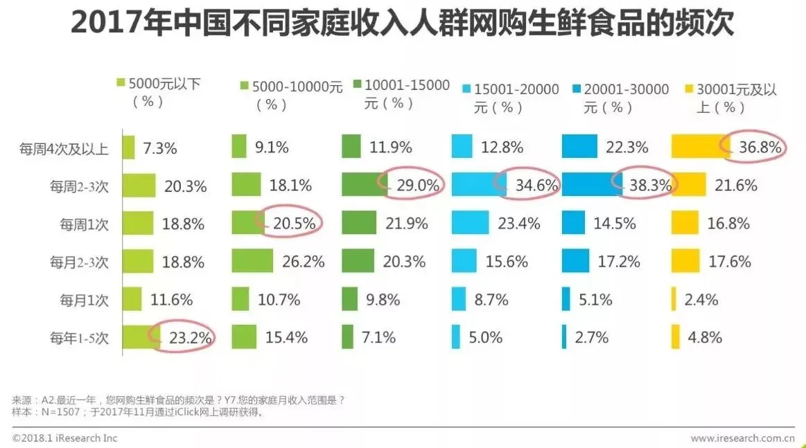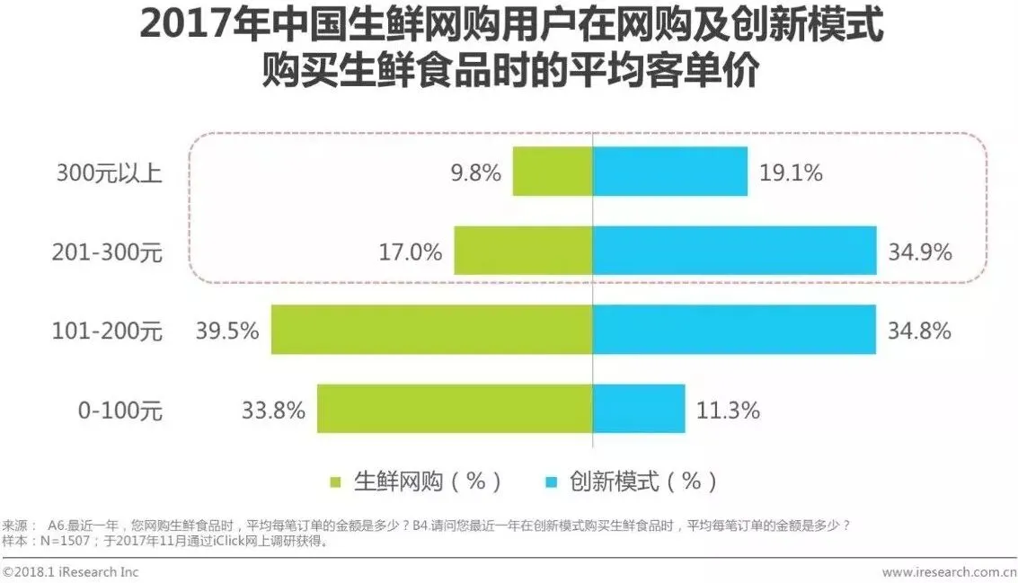从消费金额来看,用户在创新模式消费的单均价明显高于生鲜网购整体,超过50%的用户在创新模式消费的单均价超过200元。其中,19.1%的用户在创新模式消费单均价超300元,而这一比例在整体生鲜网购平台仅9.8%。34.9%的用户在创新模式的客单价在201-300元之间,仅有17.0%的整体生鲜网购用户客单价在这一区间。