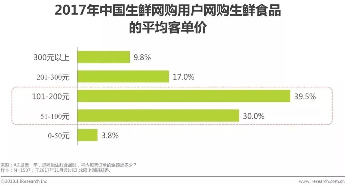 从消费金额来看,生鲜网购用户网购生鲜食品的金额大多在51-200元之间,其中39.5%的用户平均每笔订单的金额在101-200元之间;30.0%的用户平均每笔订单的金额在51-100元之间。