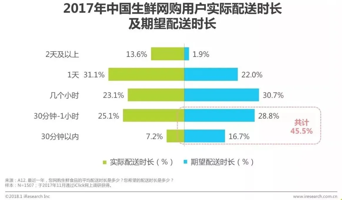 配送时长方面,用户期待更快速的配送体验。30.7%的用户希望能在几个小时内收到商品,28.8%的用户希望在30分钟至1小时收到商品,16.7%的用户希望能够在30分钟以内收到商品。