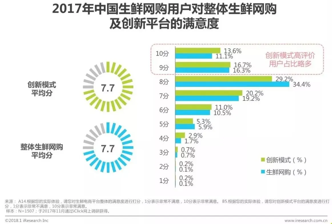 用户对创新平台整体较为满意,59.5%的用户对创新平台的满意度评分在8分以上。从平均分来看,用户对创新模式与生鲜网购的满意度基本一致,平均分均为7.7分。从占比来看,用户对创新模式评价较高,评分在9分或10分的用户占比略高于生鲜网购。