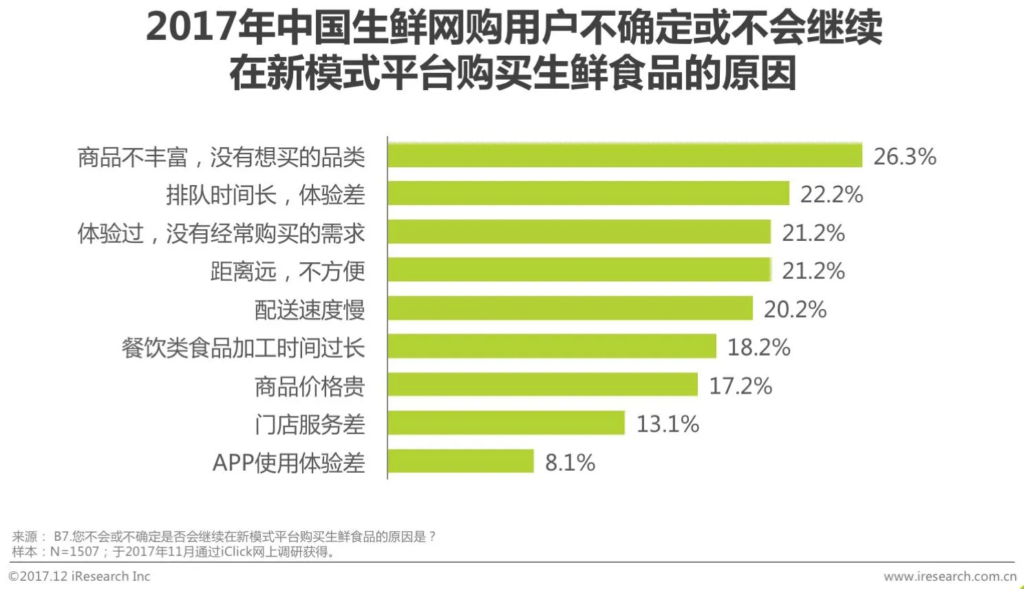超过九成的用户表示将继续在创新模式平台购买生鲜食品。用户不确定或不会继续购买的主要原因为商品品类不够丰富;其次,客流量较大导致门店排队时间长带来的不便体验也是导致用户不愿意继续在创新模式平台消费的重要原因。