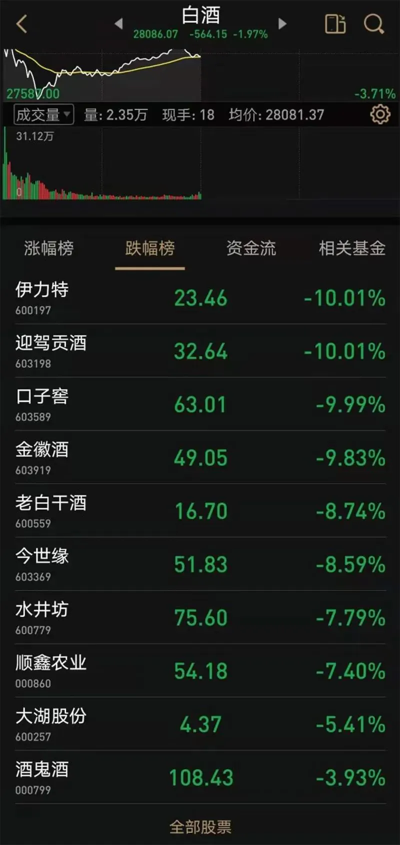 11月13日早盘,近期表现强势的白酒板块降温,多只概念股被砸,仅2只个股上涨。截至发稿,伊力特跌停,金徽酒、迎驾贡酒、口子窖等多股均不同程度下挫。