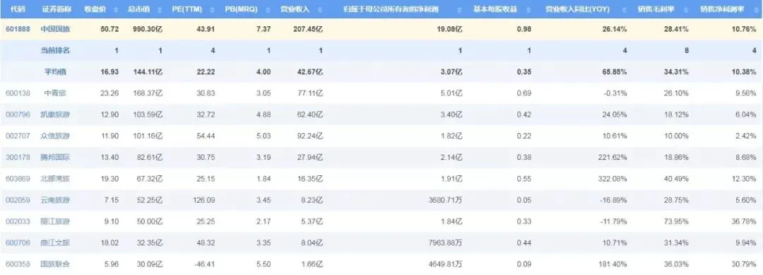 作为A股旅游板块内唯一纳入MSCI标的的公司,中国国旅在营收、归母净利润、总市值、基本每股收益这四项指标上均名列榜首,龙头地位明显。