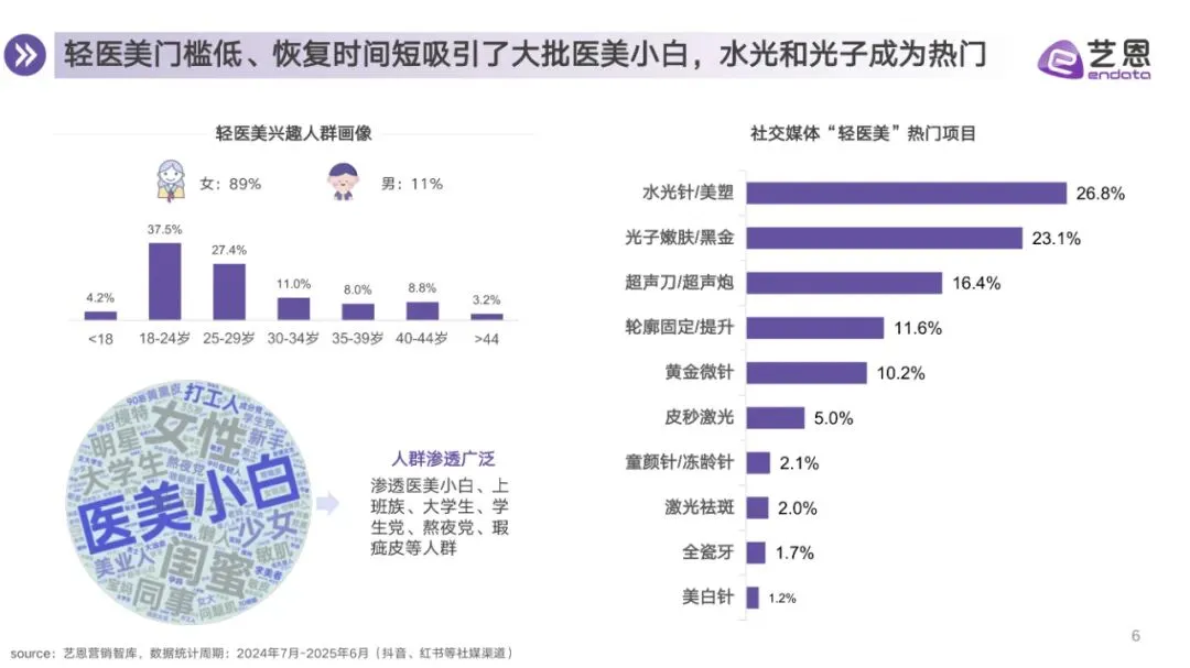 2025年6-8月“考试后医美”社媒声量达27.4万条,同比+245%;互动总量551万,+50%。18-24岁学生占项目体验人群43%,双眼皮手术声量最高,黄金微针、光子嫩肤同比+350%。“妈生感”审美关键词热度+350%,超60%笔记提及“利用假期恢复”。家长付费比例达38%,平均客单价2980元,以光子嫩肤(均价880元)与黄金微针(均价1980元)组合最受欢迎。