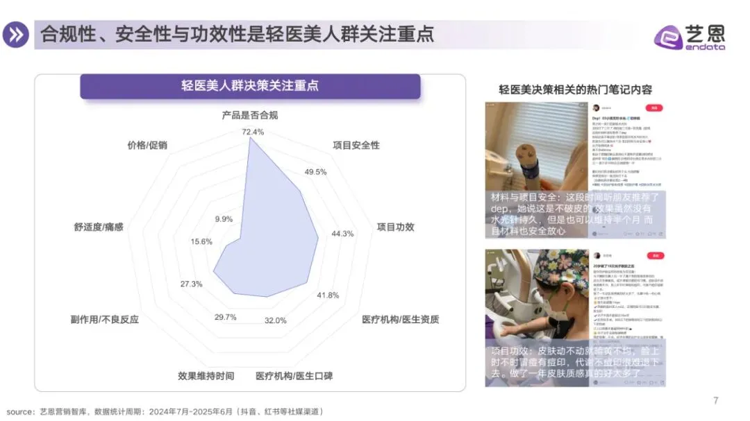 轻医美以“微创/无创+短恢复”降低决策门槛,2025年市场份额52%,首次超过重医美;注射类与光电类合计占轻医美91%。社媒兴趣人群中18-34岁占75%,水光针、光子嫩肤社媒声量分别达23.1万、26.8万条,同比+45%、+38%。72.4%用户把“产品是否合规”列为首要关注,瑞蓝冠名剧集《以美之名》带动品牌NSR(净情感率)100%,相关笔记互动量环比+267%。