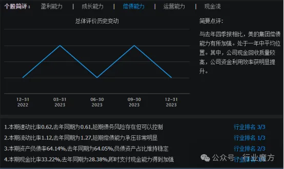 与2022年四季报相比,2023年第4季度,美的集团偿债能力有所加强。处于一年中平均位置。其中,公司现金回收质量较高,公司资金利用效率获明显提升。