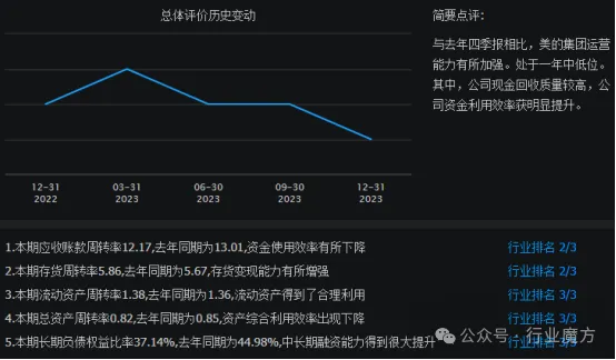 与2022年四季报相比,2023年第4季度,美的集团运营能力有所加强。处于一年中低位。其中,公司现金回收质量较高,公司资金利用效率获明显提升