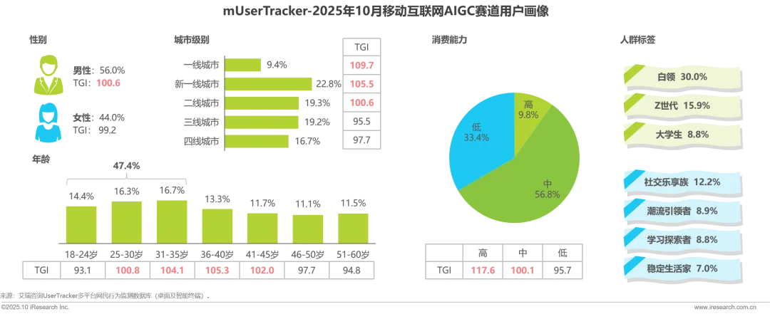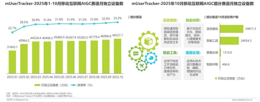 2025年前10个月,AIGC赛道进入规模化应用期,用户规模4.83亿,市场渗透率突破30%。