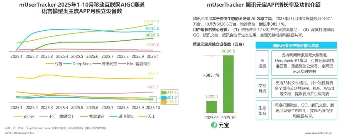 2025年1-10月,国内移动端AIGC语言模型类APP流量呈显著分化趋势,头部APP增长较为稳定,中小APP增长乏力。豆包、DeepSeek、腾讯元宝等头部语言模型类APP的月独立设备数均突破 5000 万台,其余中小APP月独立设备数均在2000万以下,且用户增长停滞,表明通用型语言模型市场已饱和,中小APP需转向垂直场景突围;腾讯元宝自今年2月重磅更新后,近9个月复合增长率达385.1%,增速大幅领先于同类型APP;其用户增长得益于天然流量池扶持和腾讯系生态协同。