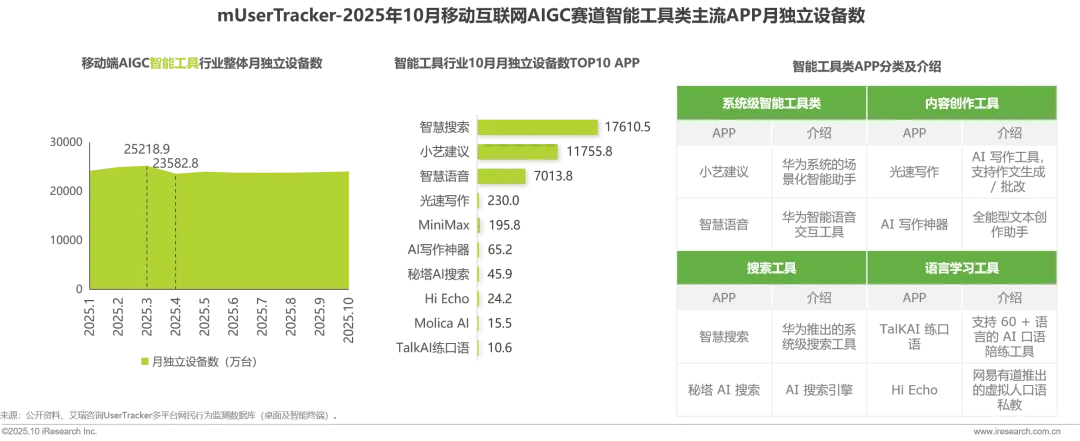 2025年1-10月,国内移动端AIGC智能工具类APP用户规模稳定在20000万台以上,于3月达到顶峰值25218.9万台,是 AIGC 赛道中用户基础最稳固的细分领域之一。2025年10月,月独立设备数TOP10 APP中华为系 “智慧搜索、小艺建议、智慧语音”位列前三,智能工具与设备 / 平台生态深度绑定,独立工具或较难突破生态流量的壁垒。