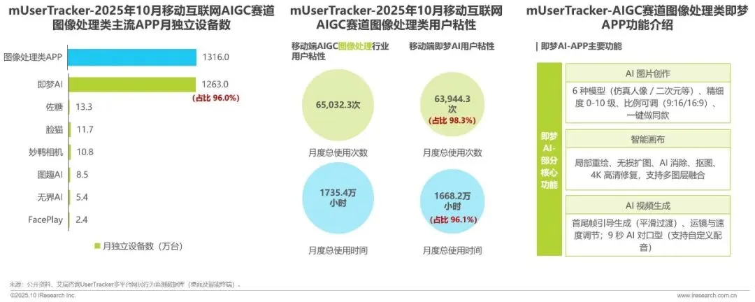 2025年10月,移动端AIGC图像处理赛道呈现头部APP用户规模断层领先态势,中小APP生存空间极窄。即梦APP从月独立设备数(1263.0)、月度总使用次数(63,944.3次)、月度总使用时间(1668.2 小时)三方面在AIGC图像处理行业占比超95%。中小APP虽用户规模小,但聚焦垂直场景的专业度仍有希望留存特定用户,如妙鸭相机聚焦人像、FacePlay聚焦特效。