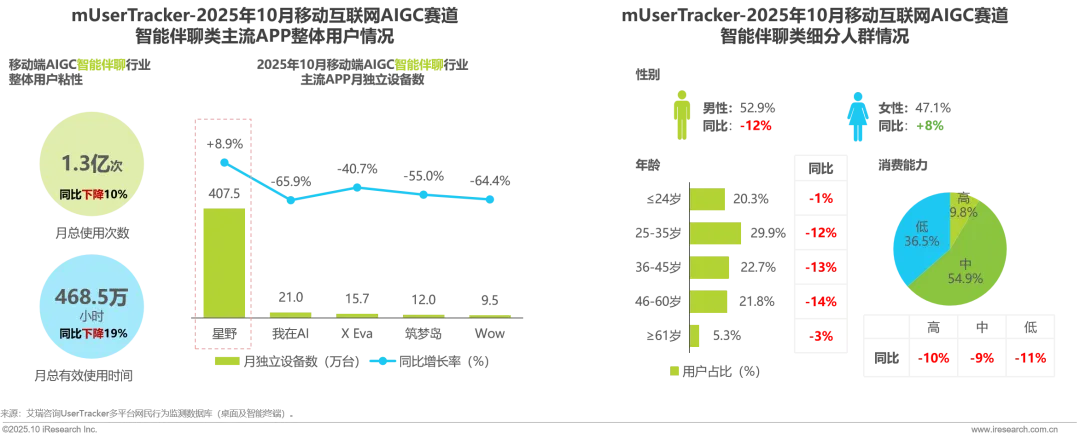 2025年10月移动互联网AIGC智能伴聊赛道用户粘性下降、增长放缓,用户月度使用次数和使用时间同比下降超10%,主流APP中仅星野APP用户规模正增长,其余APP用户流失超40%。细分人群来看,各年龄层级和各消费层级用户规模同比均下降,而女性用户占比提升,反映情感陪伴对女性的吸引力相对更强。