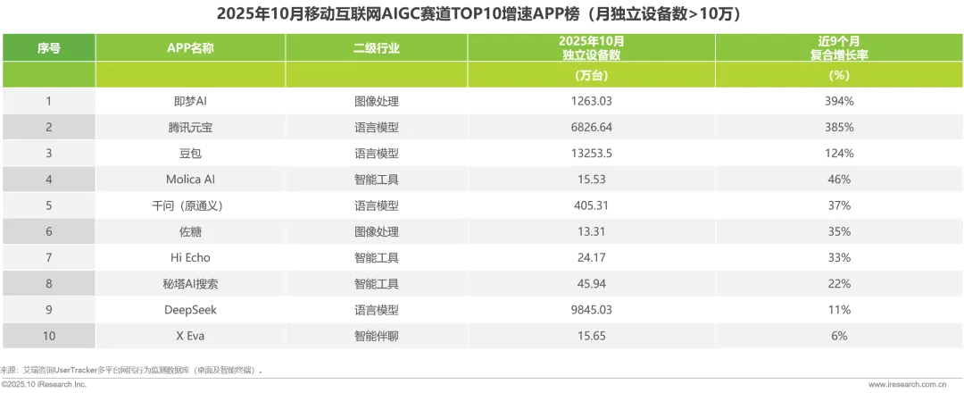 截至10月,即梦AI、腾讯元宝、豆包等APP在今年近10个月内用户增长速度领先。