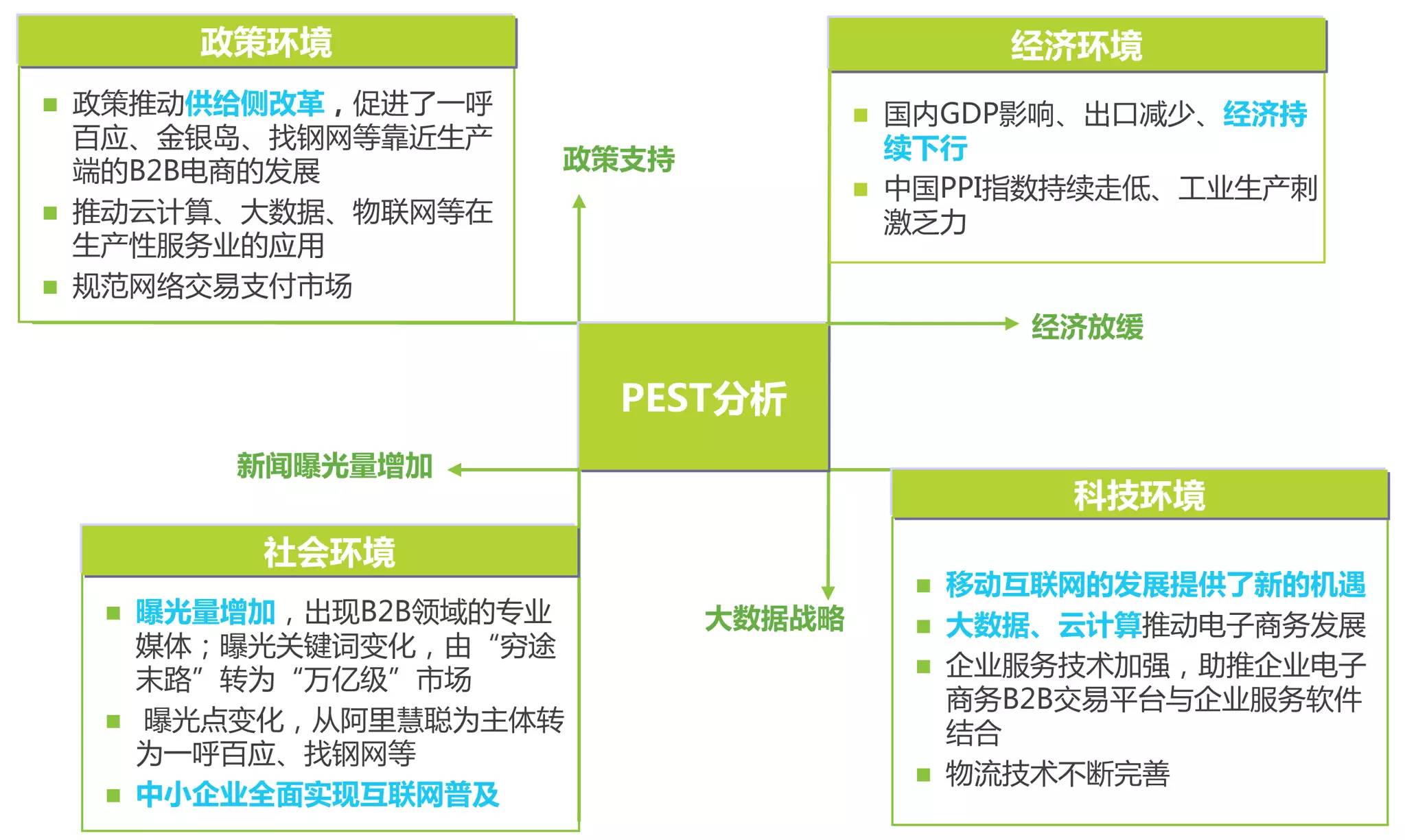 艾瑞分析认为,制造业转型升级以及国家对网络经济的扶持为B2B电商发展提供了良好的外部环境,政策环境利好。