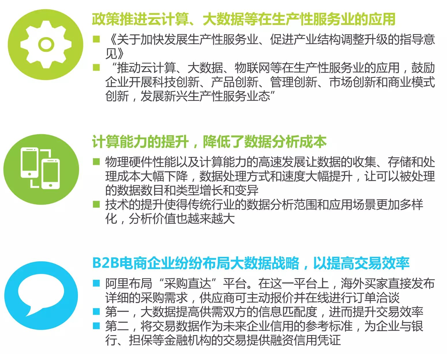 艾瑞分析认为,随着云计算和大数据技术的提高,B2B电子商务将得到极大的发展。一方面能够更为精准地分析市场需求,提高交易的质量和效率;另一方面,通过云计算和大数据分析,B2B电商能够将企业的交易数据提供给银行等相关金融机构,作为企业融资的重要信用凭证。