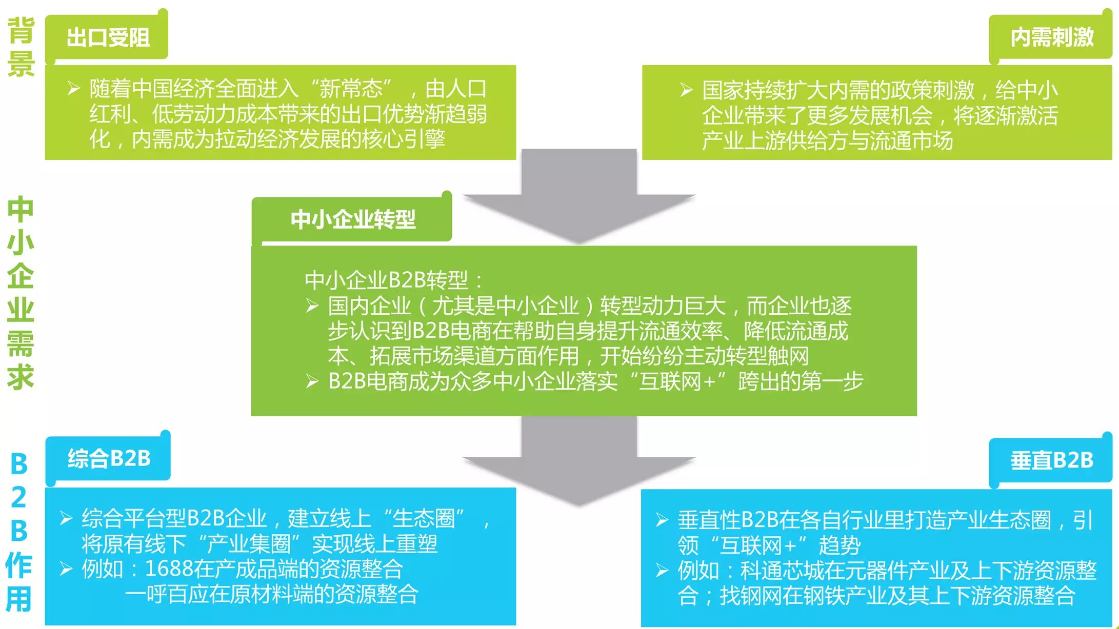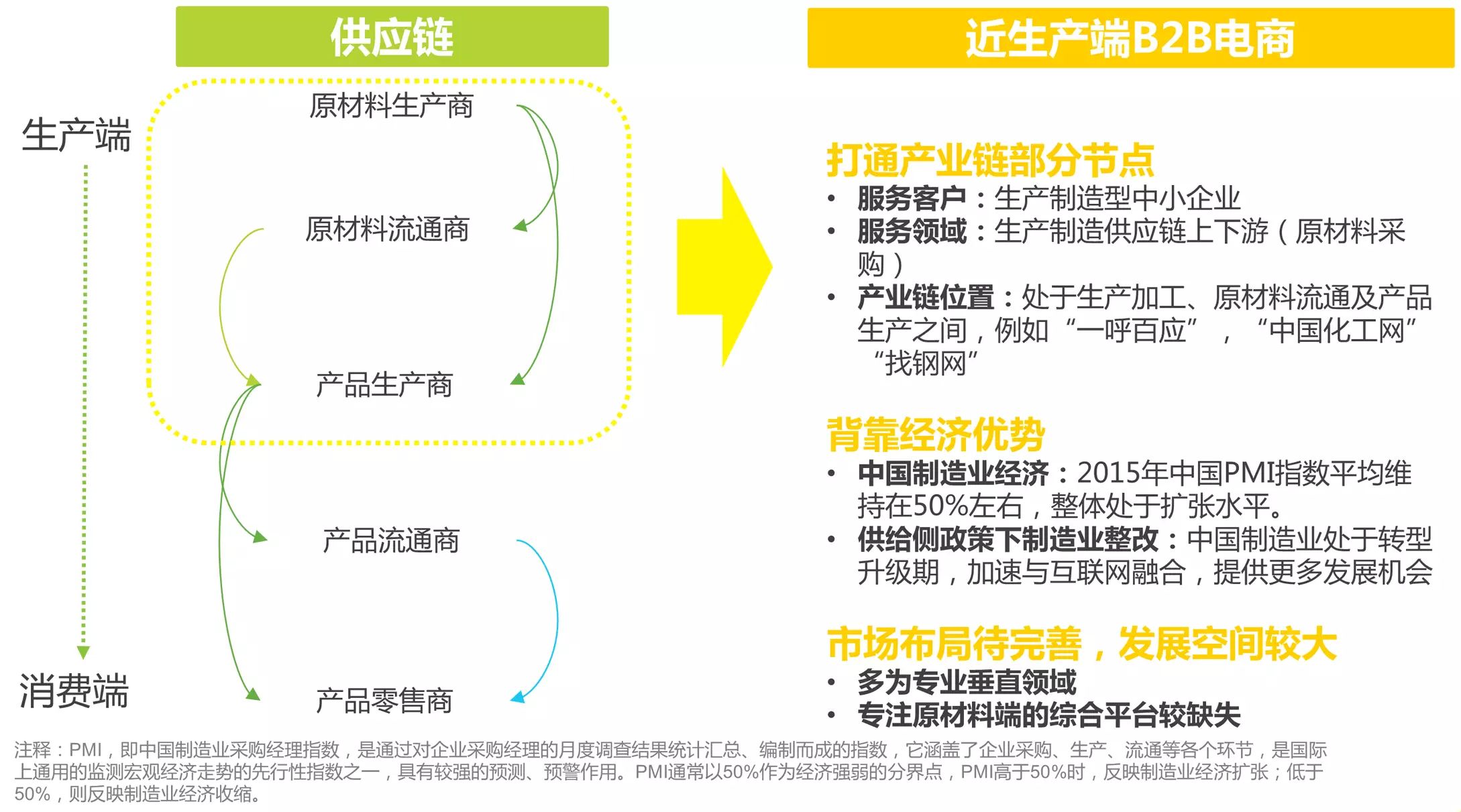 一方面,供给侧改革为传统产业转型提供了良好的政策支持,将极大地带动近生产端B2B电子商务的发展;另一方面,传统制造业转型升级,对专注生产端的B2B电子商务需求旺盛。